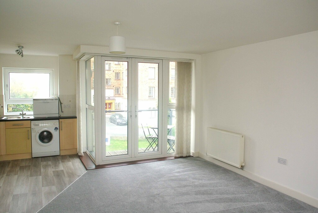 The kitchen has a range of modern wall and base units with a sink by the window. There is an integrated washing machine and space for tall fridge freezer.