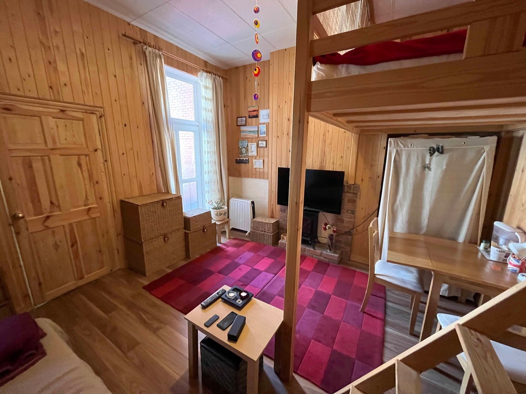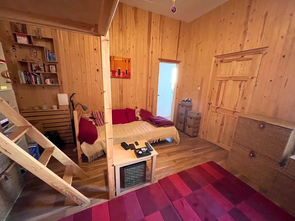 The living room has a window to the front and pine panelling with space for a sofa and small table whilst the double bed is currently on a raised platform to one corner.