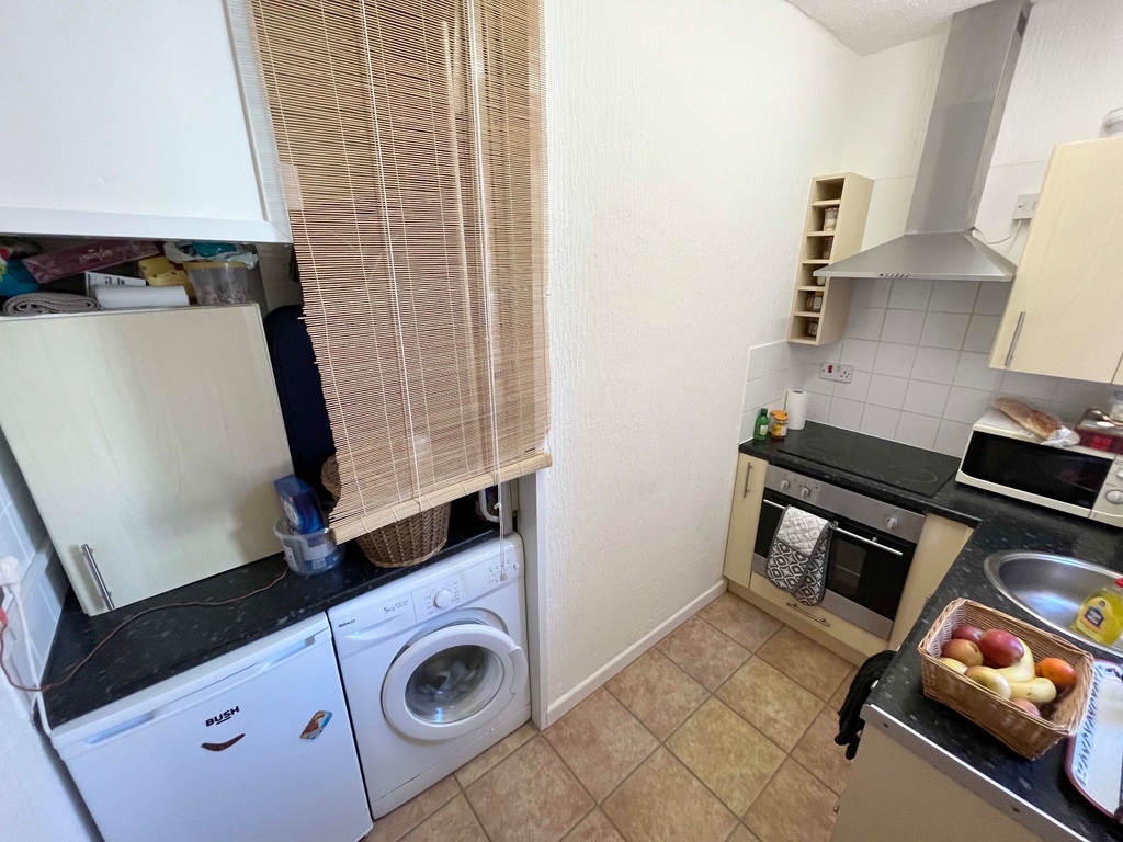 This leads to the separate kitchen that has a door to the left into the living room with the kitchen to the right. There is a round sink by the window inset into lamite work tops with a range of wood grain effect units above and below. Cooking facilities are provided by a four ring electric hob with housed oven under and stainless steel extractor over. There is space and plumbing for a washing machine and also a fridge/freezer.