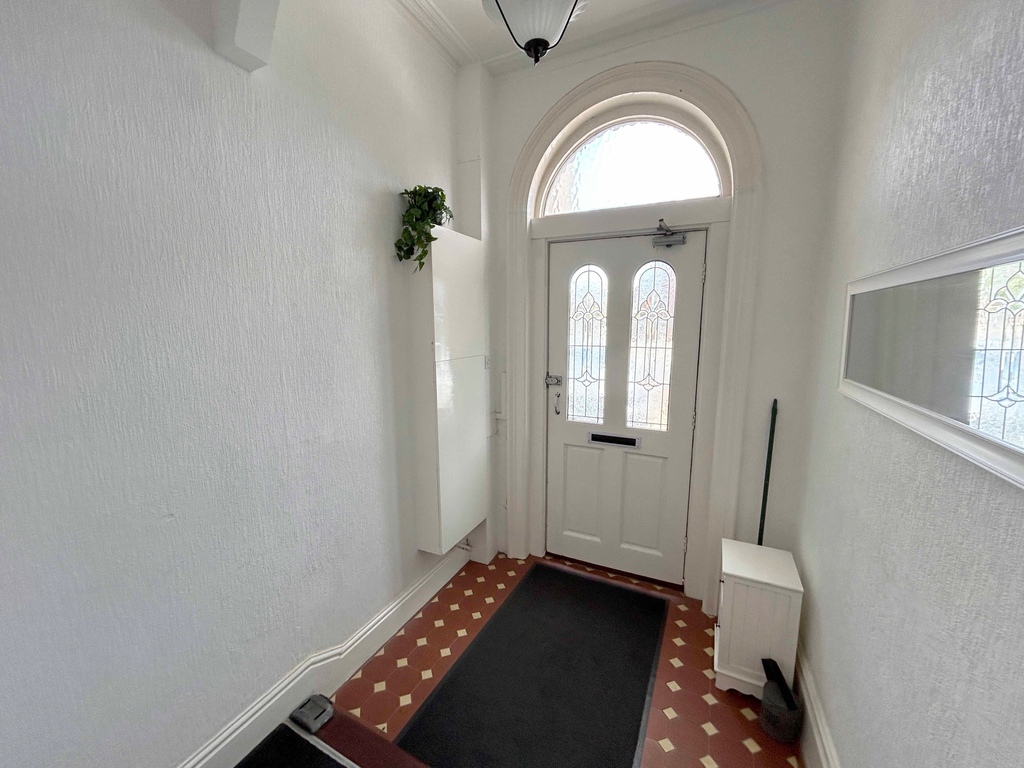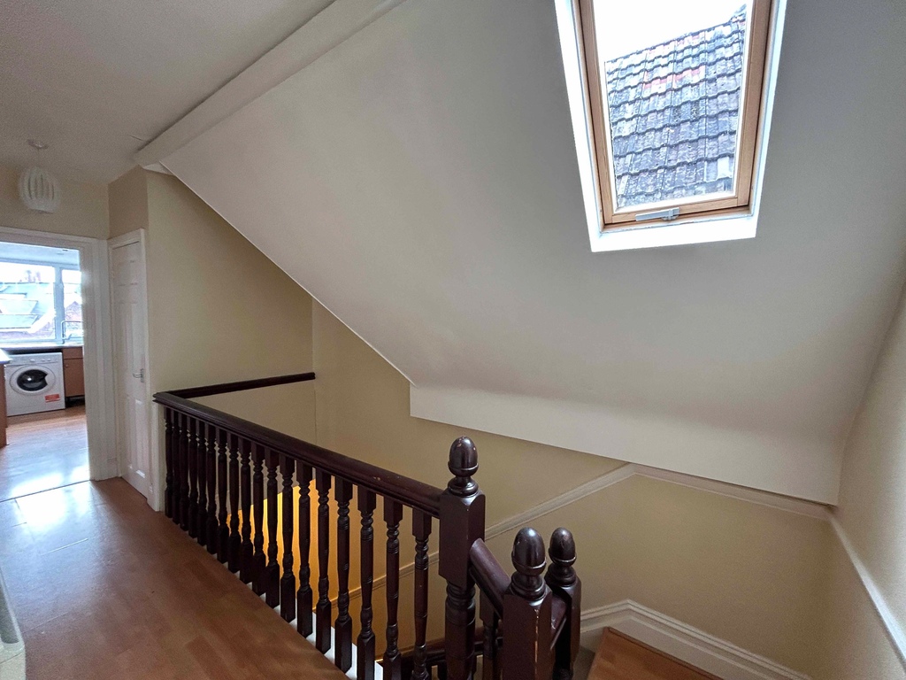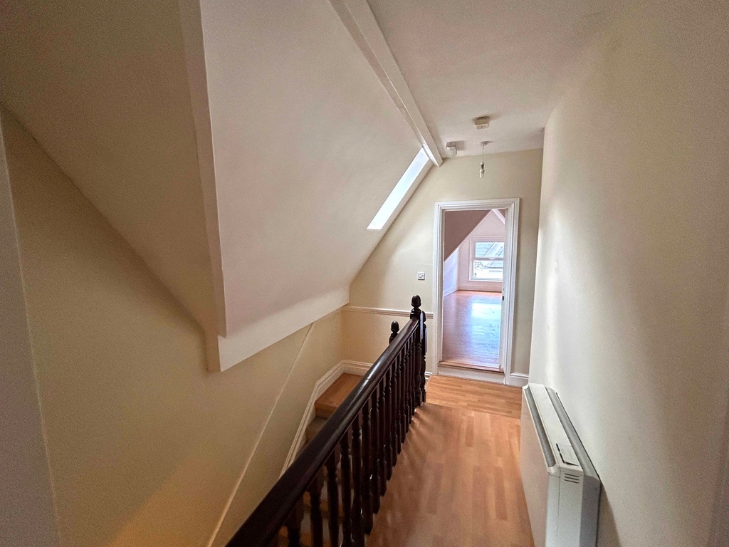 From the front parking area, the original, communal front door leads to a stairway to the first floor and the front door of the flat. There is a lobby area for coat hanging etc…and then a second stairway leads up to the main landing and the flat proper. The landing has a skylight window and then doors leading to all the rooms.