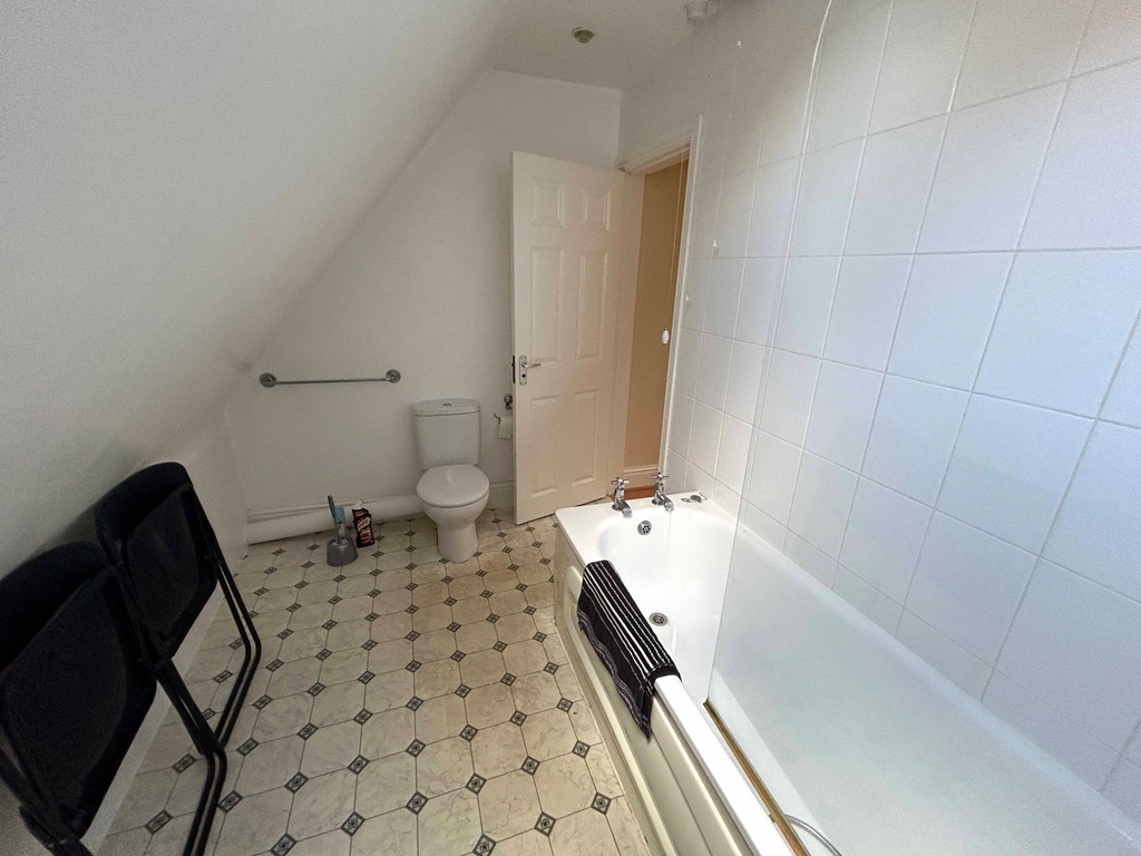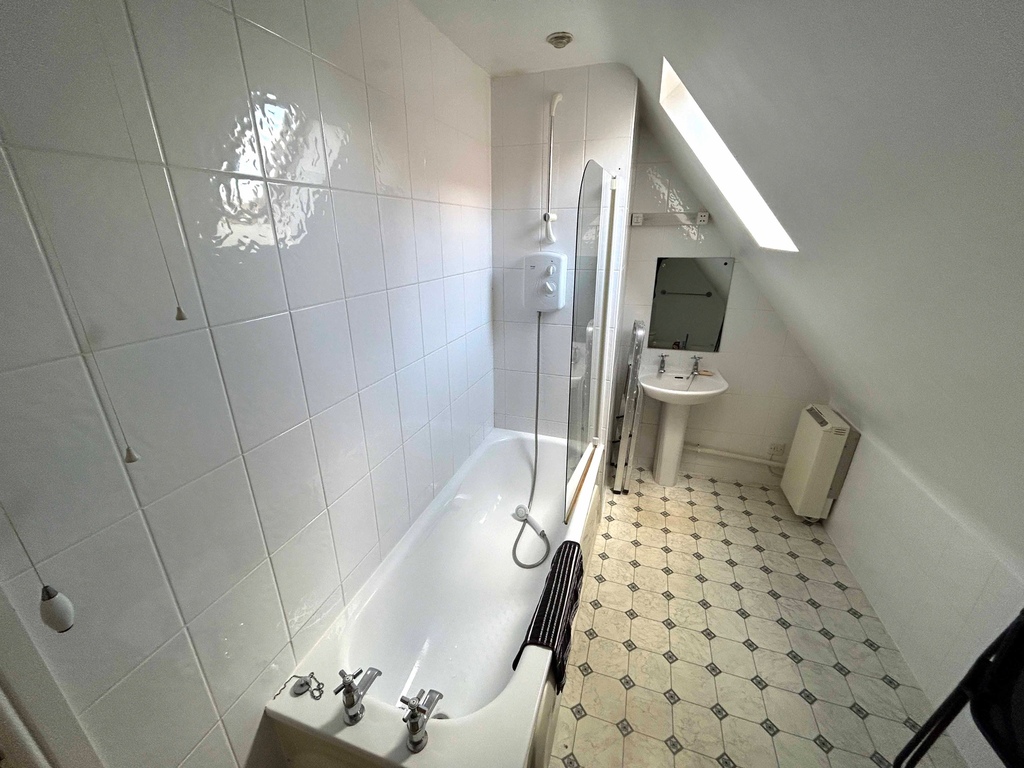 The bathroom has a Velux style window to the side and has a bath with shower over, WC and basin.