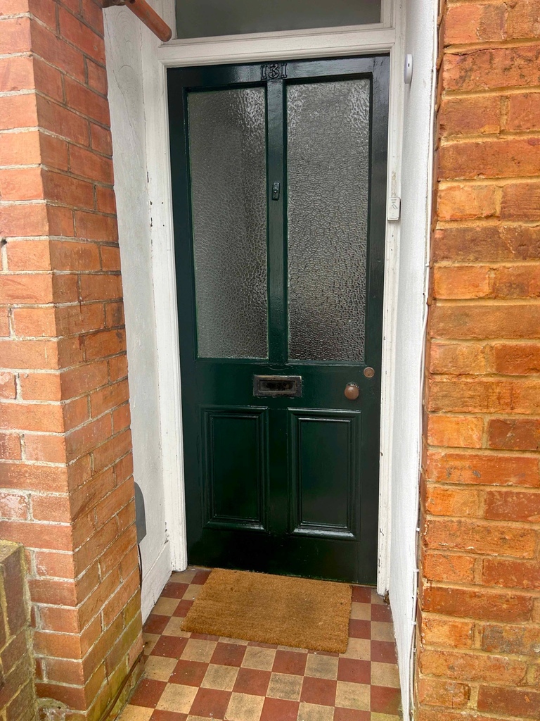 A path leads up to the inset front porch and then to the front door shared with the ground floor flat.