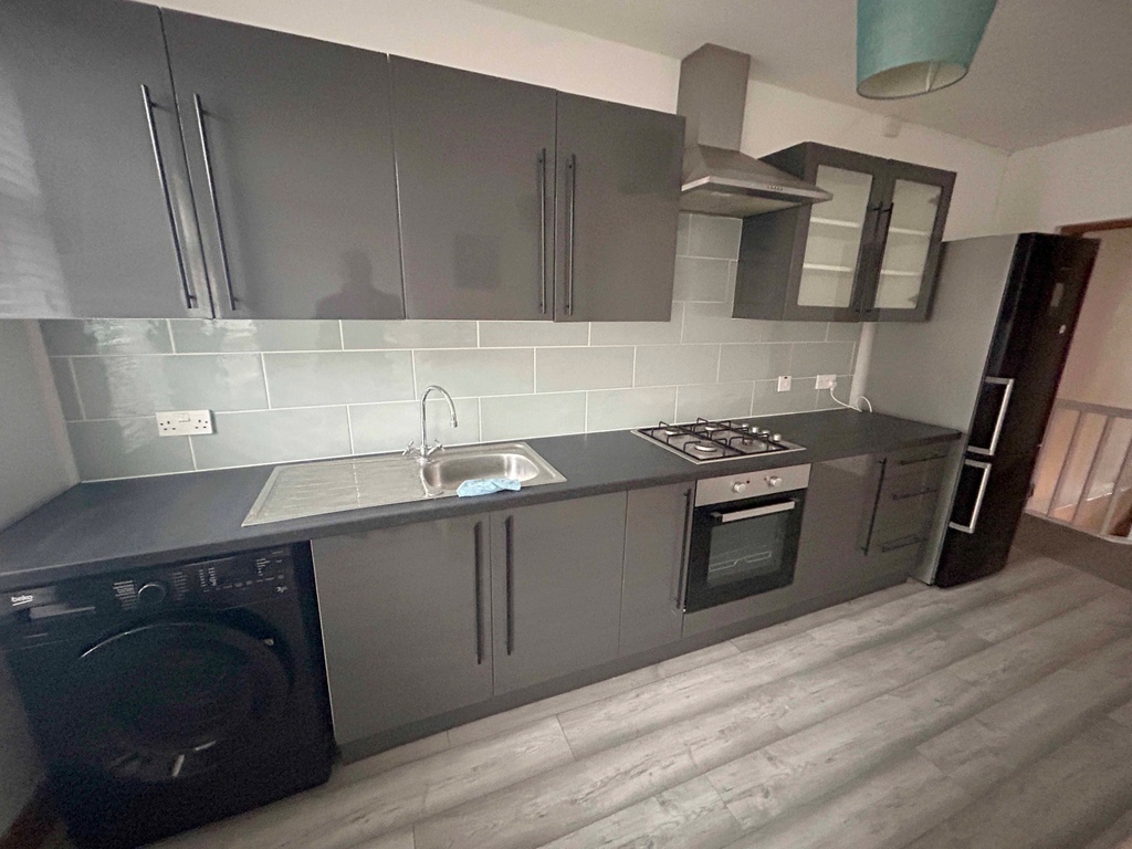 The whole room has attractive wood laminate flooring and the MODERN KITCHEN has a good range of base and wall units with laminate worktops and contemporay tiled spalshbacks.