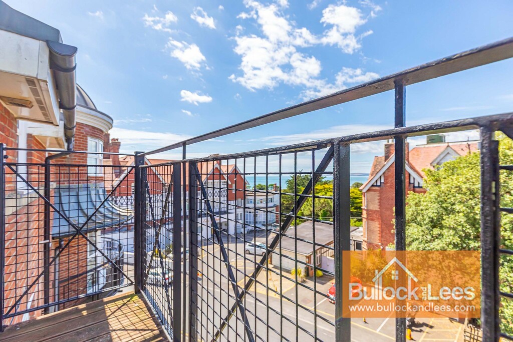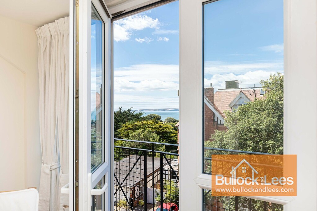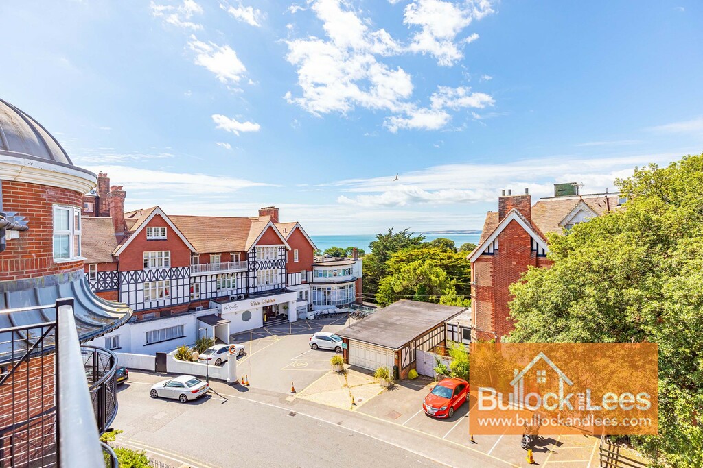 The living room and balcony offer sea views over and around the Chine Hotel, out over Poole Bay and towards the Purbecks.