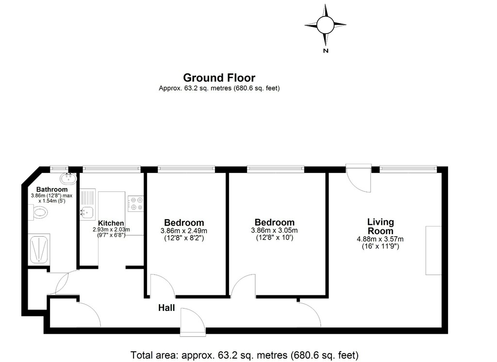 There is a hallway running the length of the flat with access to all the rooms.