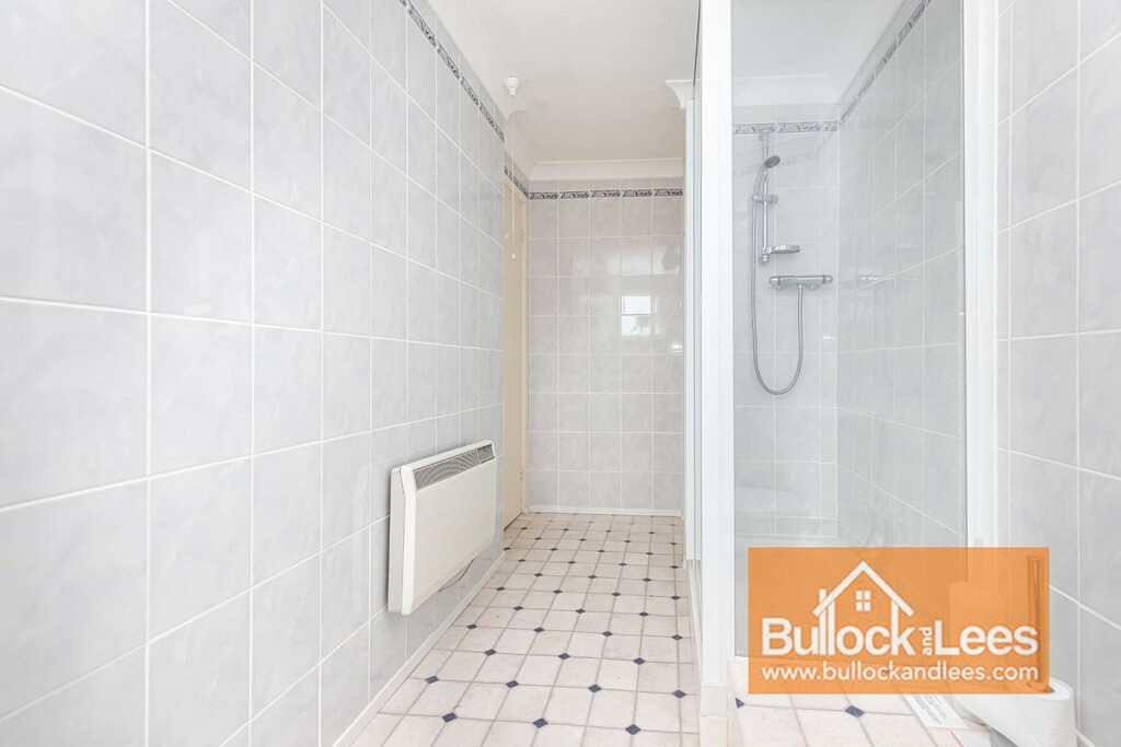 The bathroom has its own window for proper ventilation, tiled walls and a large, step in shower on the left with a WC and vanity basin at the end.