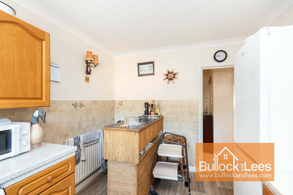 Window to the front and fitted with a good range of oak fronted units and laminate worktops. All very serviceable but a liitle old fashioned now, it could easily be improved even with just some new doors and decorations. There is a gas hob with electric oven under, a sink by the window, spaces for fridge/freezer and washing machine and even a breakfast table.