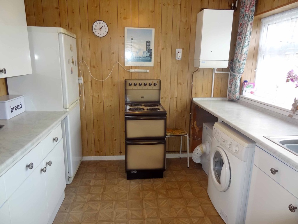 Range of fitted units, single drainer sink and double glazed window overlooking front garden. Work surfaces, space for fridge/freezer, space and plumbing for washing machine. Wall mounted gas boiler. Power points.