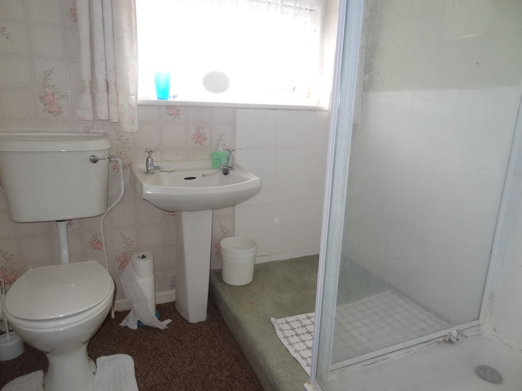 Currently arranged as a shower room. Fitted with a white suite comprising shower cubicle, low flush WC, pedestal wash hand basin, double glazed window to front. Radiator.