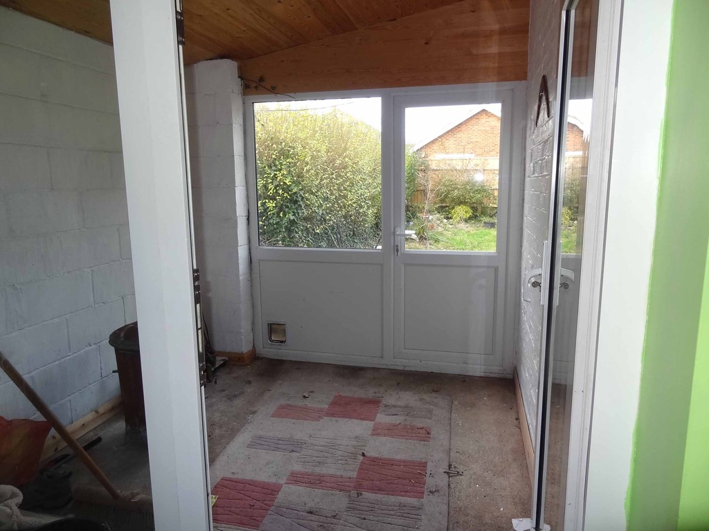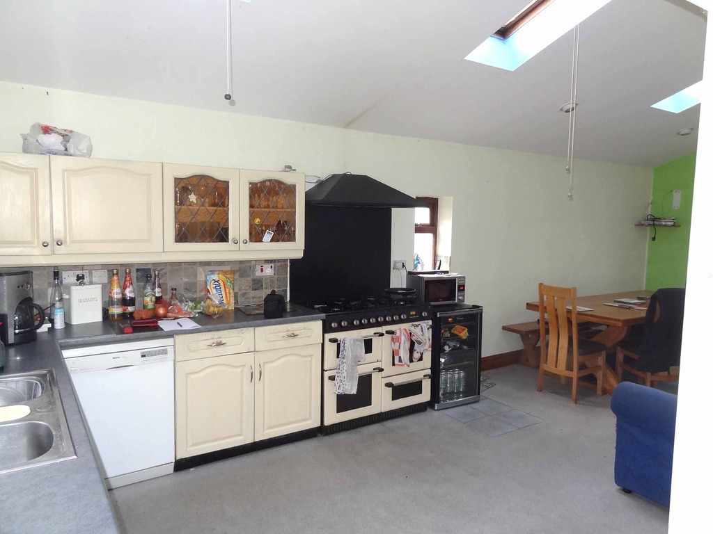 Spacious kitchen with range of roll edged work surfaces, wall mounted cupboards and matching base units. Space and plumbing for washing machine and dishwasher. UPVC double glazed windows to front aspect and large double glazed doors to rear aspect. Three Velux windows inset into roof allowing in light. Lean to porch area with UPVC double glazed doors to rear garden.