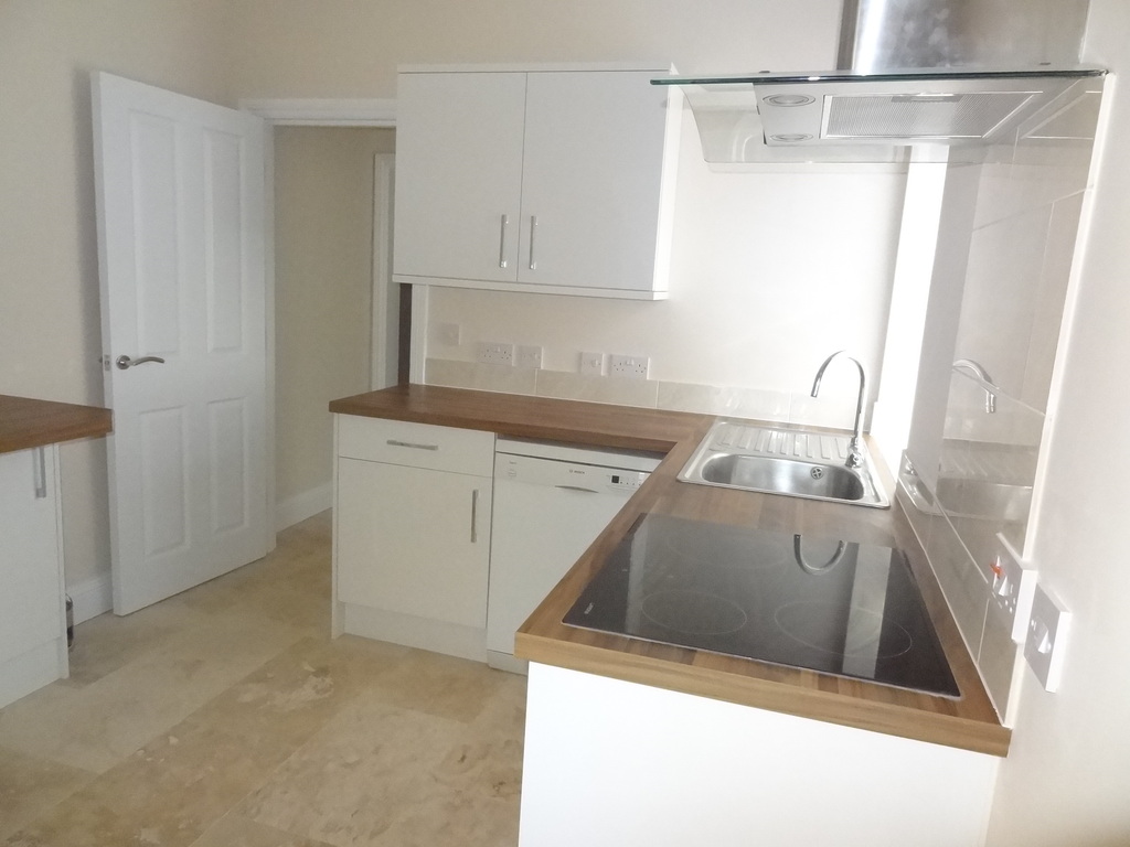 Modern, fitted with a range of base and eye level storage units and work surfaces with built in basin and mixer tap, hob and extractor hood and oven, space and plumbing for dishwasher and space for under counter fridge freezer. Window to side