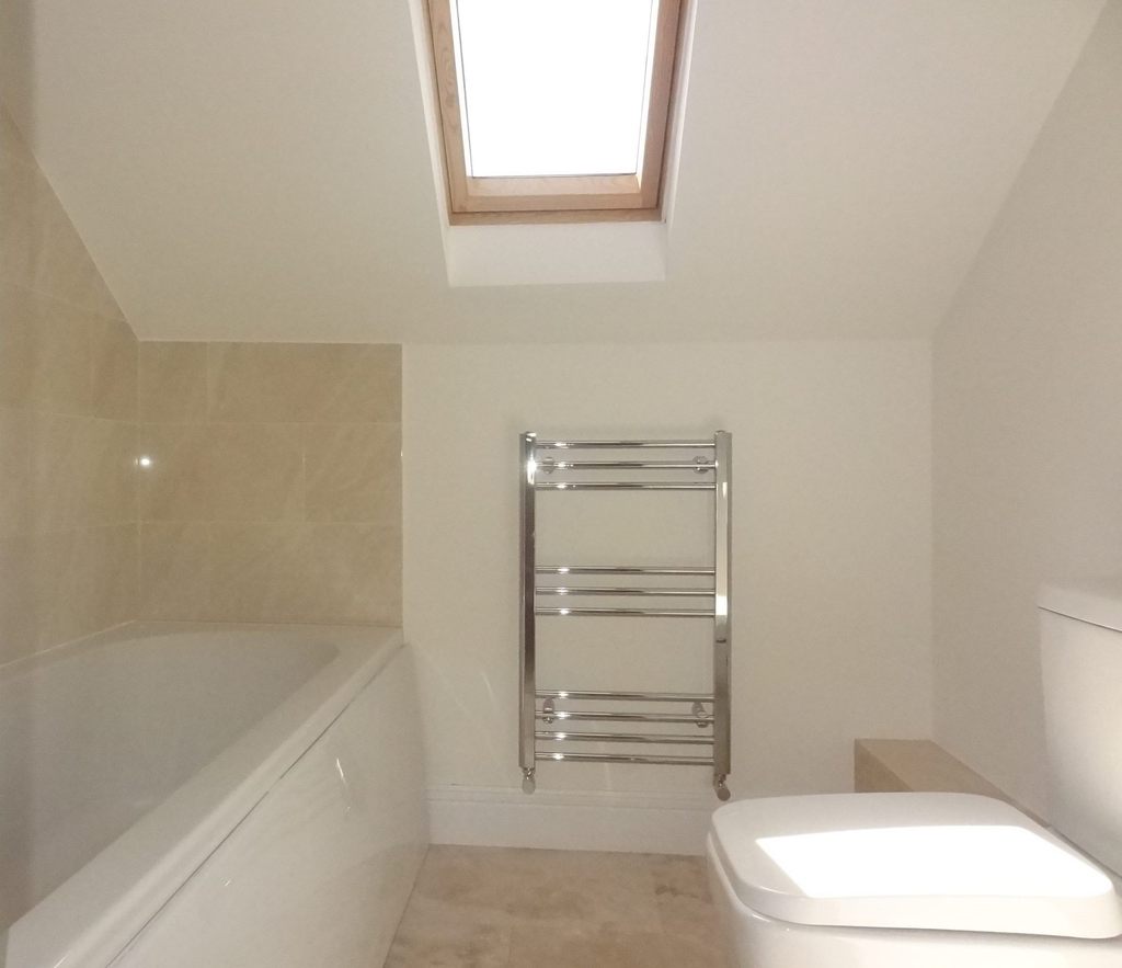 Panelled bath, low level W.C. pedestal hand basin and towel rail. Velux Window to rear aspect.