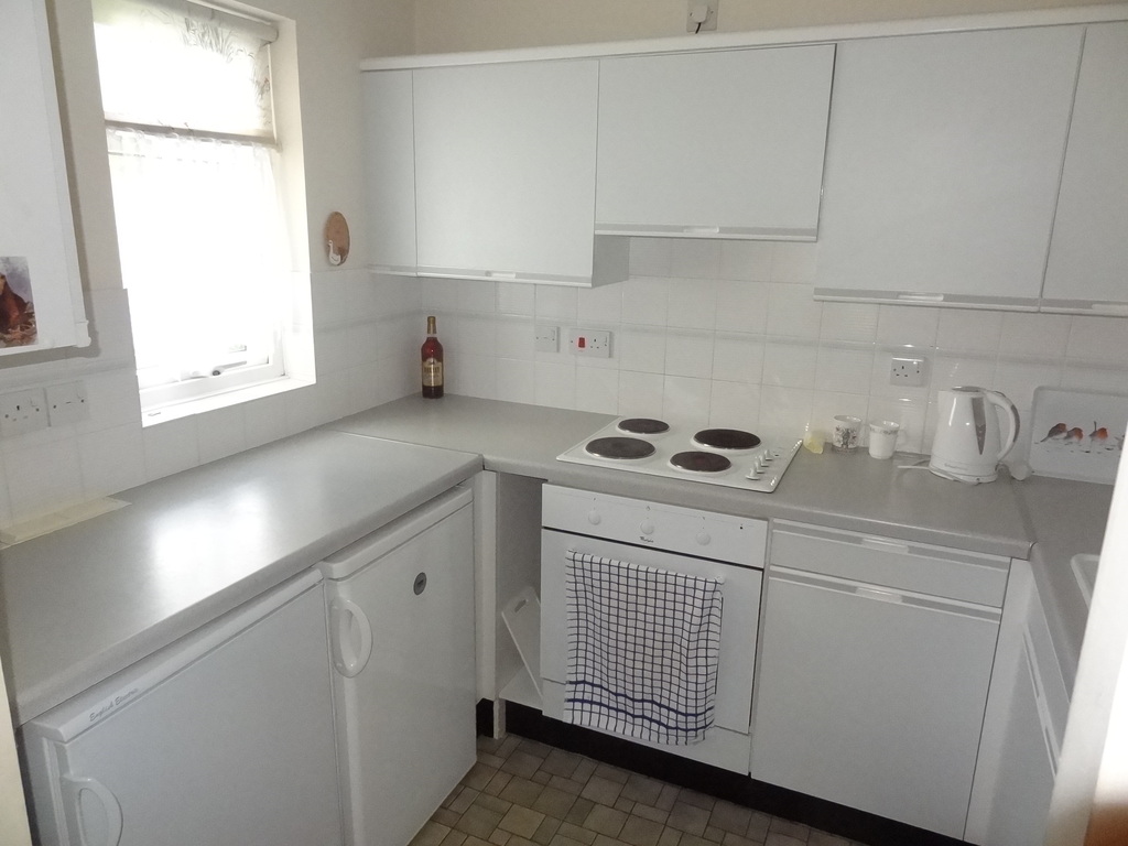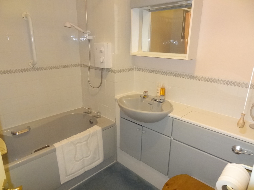 Side aspect UPVC double glazed window overlooking communal gardens. Granite effect roll top work surfaces with integrated four plate electric hob and extractor hood above. Inset one and half bowl sink and draining board with mixer tap. A range of under counter and wall mounted storage units. Space and plumbing for a washing machine. Space for compact under counter fridge and additional space for compact under counter freezer. Wall mounted electric heater. Tiled splash back surfaces.