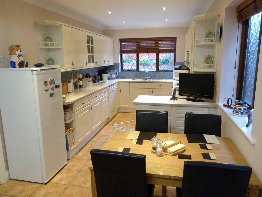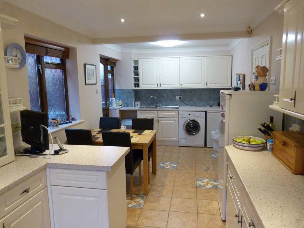 Matching range of wall and floor mounted cupboard units with inset single drainer stainless steel 1.5 bowl sink unit. Integrated gas hob with extractor over and double oven/grill under. Space and plumbing for dishwasher. Area for table and chairs. Additional utility area at one end with matching units and inset stainless steel 1.5 bowl sink unit with space and plumbing for washing machine. There are two double glazed windows to the side elevation and a further double glazed window to the rear elevation. Door to side footpath.