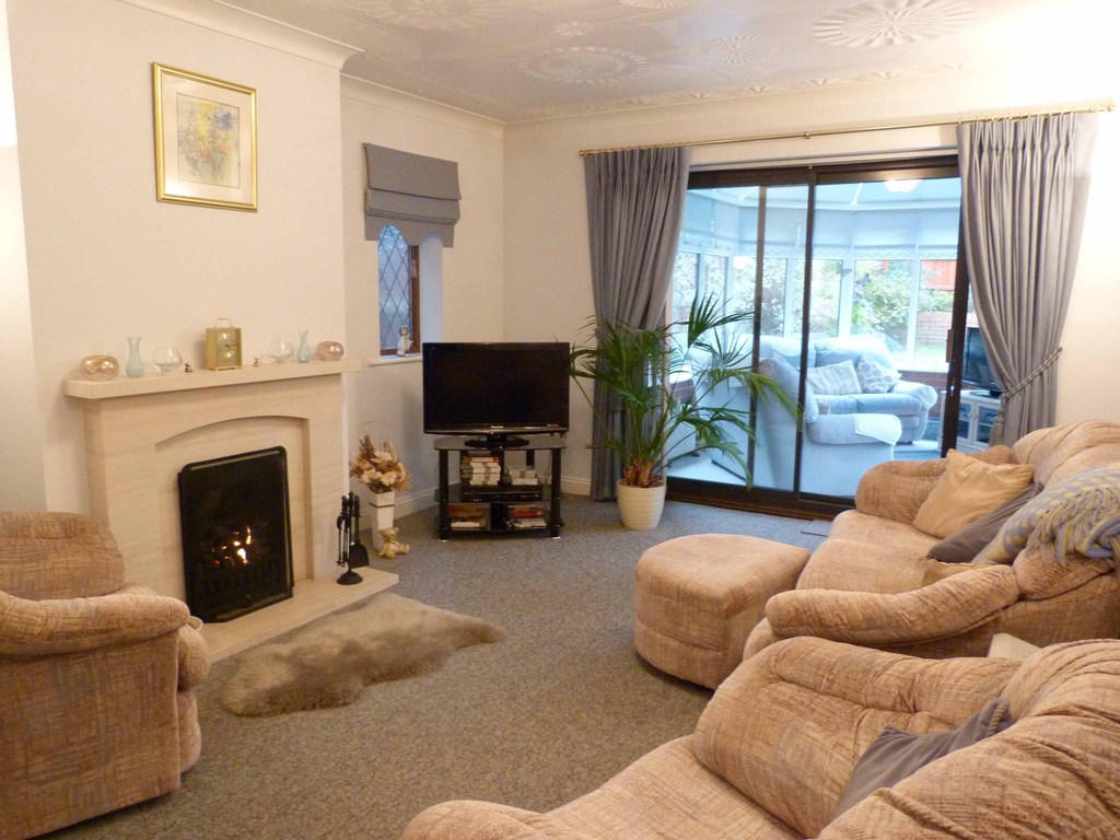 Dual double glazed side aspect windows. Limestone fireplace housing a Living Flame gas fire. Double glazed doors to conservatory and glazed double doors leading through to the:-