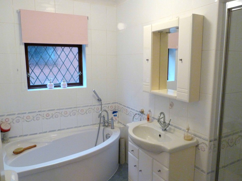 Fully tiled to all walls and floor. Matching suite comprising vanity mounted wash hand basin fitted cupboards under and cabinets over, close coupled WC, corner bath and separate shower cubicle. Double glazed side aspect window.