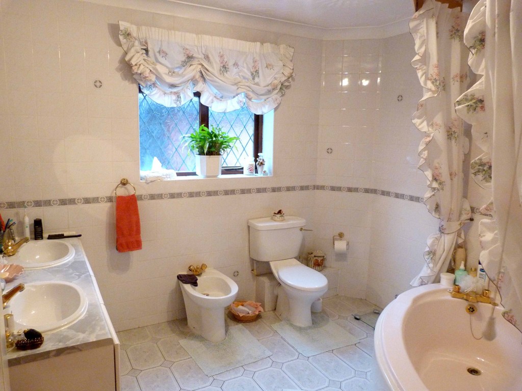 Fully tiled to all walls and floor. Twin vanity mounted wash hand basins with fitted cabinets under. Close coupled WC. Bidet. Corner bath with wall-mounted shower. Double glazed side aspect window.