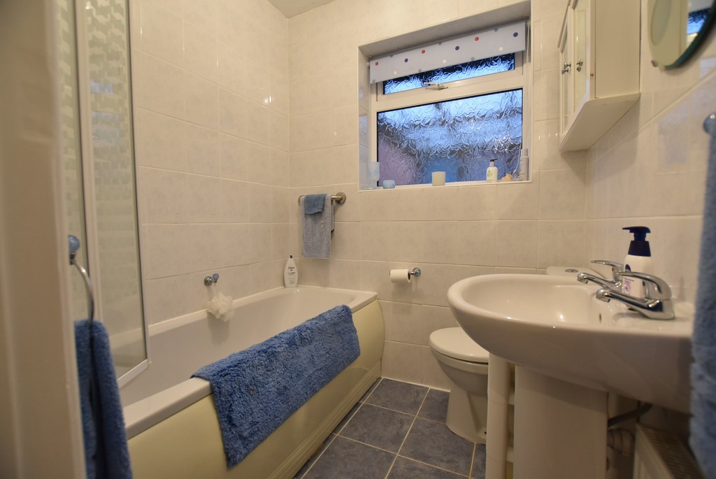 Double glazed window to side aspect, tiled floor, fully tiled walls, spot light fitting, fitted with a modern white suite comprising of low flush WC, hand basin, panel bath with shower over and folding shower screen, radiator.
