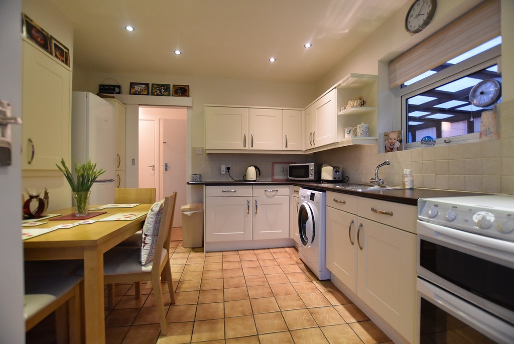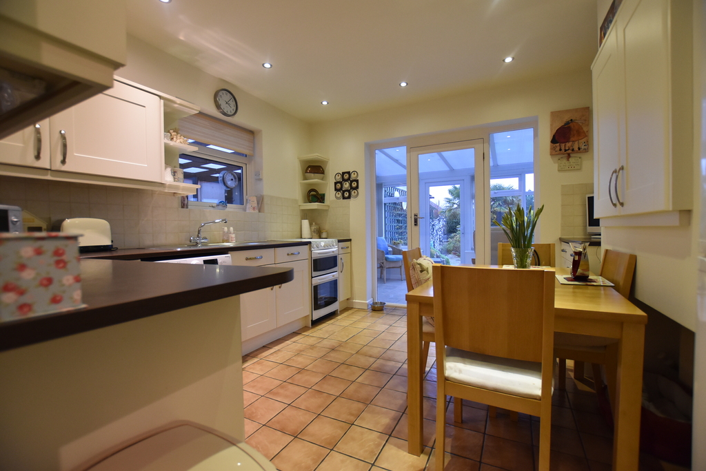 Double glazed window to side aspect, door through to conservatory, tiled floor, part tiled walls, inset LED spot lights, modern fitted cream and walnut colour kitchen with range of base and wall units, single basin with drainer, space for cooker, space for washing machine and space for upright fridge freezer, power points, TV point, radiator.