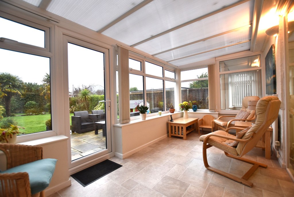 Dwarf cavity wall with modern double glazed conservatory construction, polycarbonate roof, laminate floor covering, wall mounted light fitting, power points, radiator.