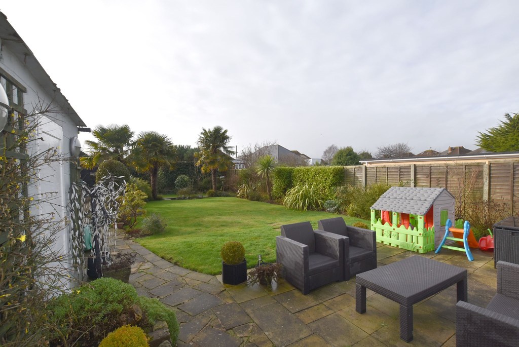 Mainly laid to lawn with various shrub and flower boarders, two features small trees, south facing and sunny aspect, small shed for storage and a covered area behind garage which could be adapted for various uses.