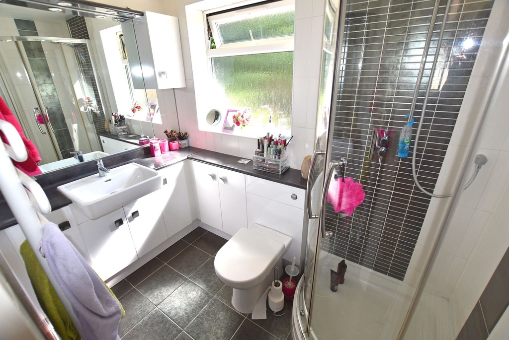 Beautiful modern white suite comprising WC, wash hand basin, shower cubicle, double glazed obscure window to rear, tiled floor, heated towel rail, fully tiled walls, down lighters.