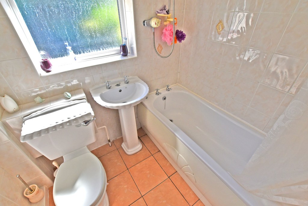 WC, wash hand basin, bath with shower over, double glazed obscure window to rear, fully tiled walls, heated towel rail, tiled floor, light point.