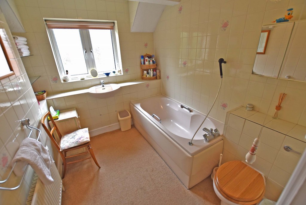 Double glazed obscure glass window to the rear aspect, radiator, fully tiled walls, concealed low flush WC, hand basin, panel bath with mixer tap, shower hose fitting.