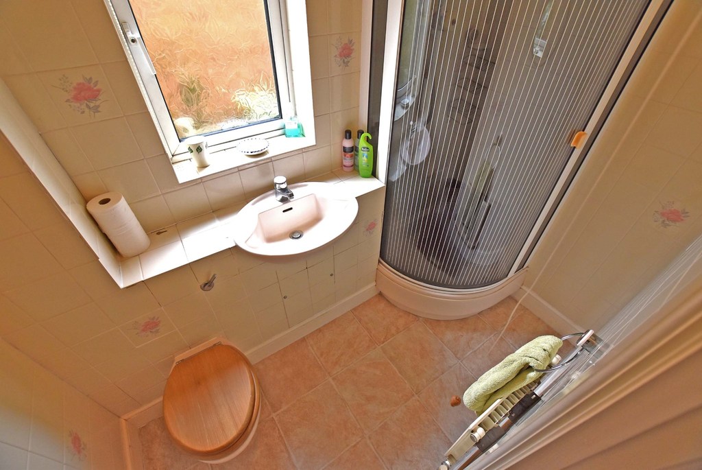 Double glazed obscure glass window to side aspect, fully tiled walls, vinyl floor covering, large corner shower with 'Aqualisa' power shower, hand basin, concealed low flush WC, radiator, coving, central light fitting.