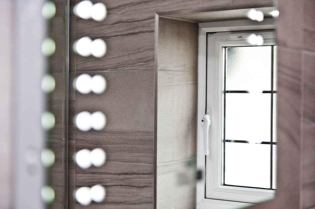 Window to rear aspect, fully tiled walls and fitted with a three pieces suite comprising ‘P-Shaped’ shower bath with wall mounted mixer tap and shower attachment with hinged glass screen to the side, closed coupled w/c and vanity basin with storage cupboard under, chrome ladder style towel rail/radiator, extractor fan.