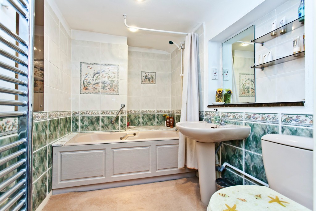 Part tiled walls (fully tiled in bath area) and fitted with a three piece, pastel coloured suite comprising bath with separate electric shower over, pedestal wash hand basin and matching w/c, radiator style towel rail and extractor fan.
