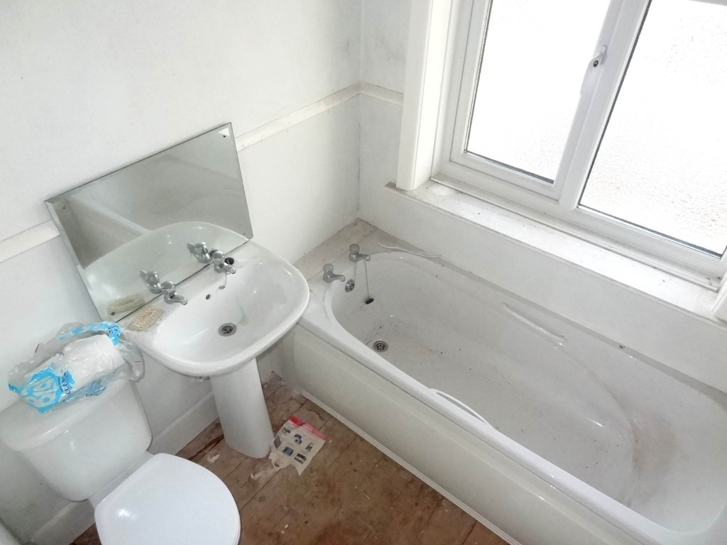 White three piece suite with obscured glazed window to front aspect and half tiled walls. Bath with wash hand basin and matching w/c to the side