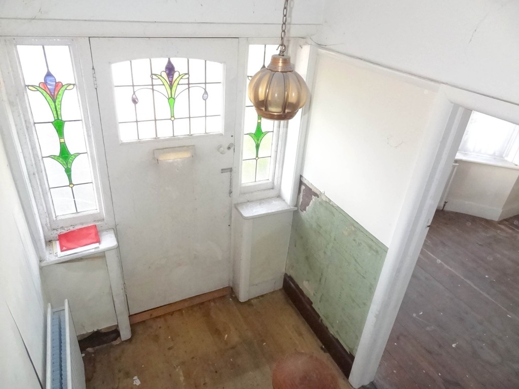 Original front door with stained glass decorative panel leads to hallway. Turning stairway to first floor landing with window to side aspect, under-stairs storage area. Doors to: