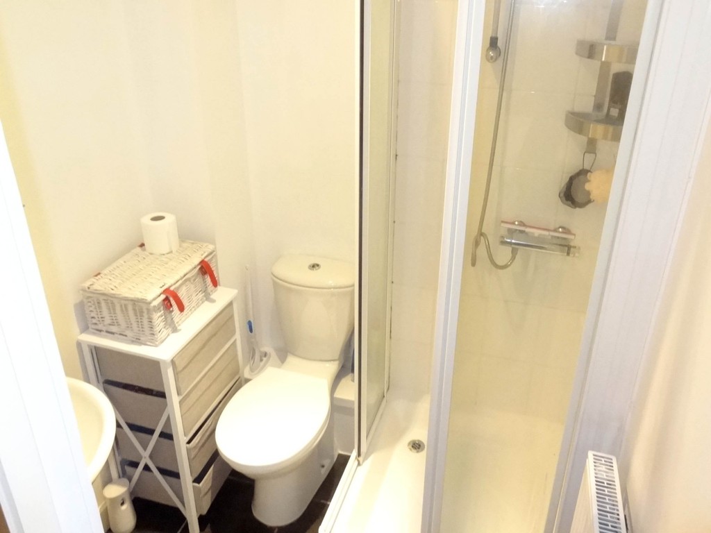 Fitted with a modern white three piece suite comprising, corner shower with sliding glass doors adjacent closed coupled w/c and wall mounted hand basin fitted with monoblock mixer tap. Ceramic tiled flooring, heater and mirror.