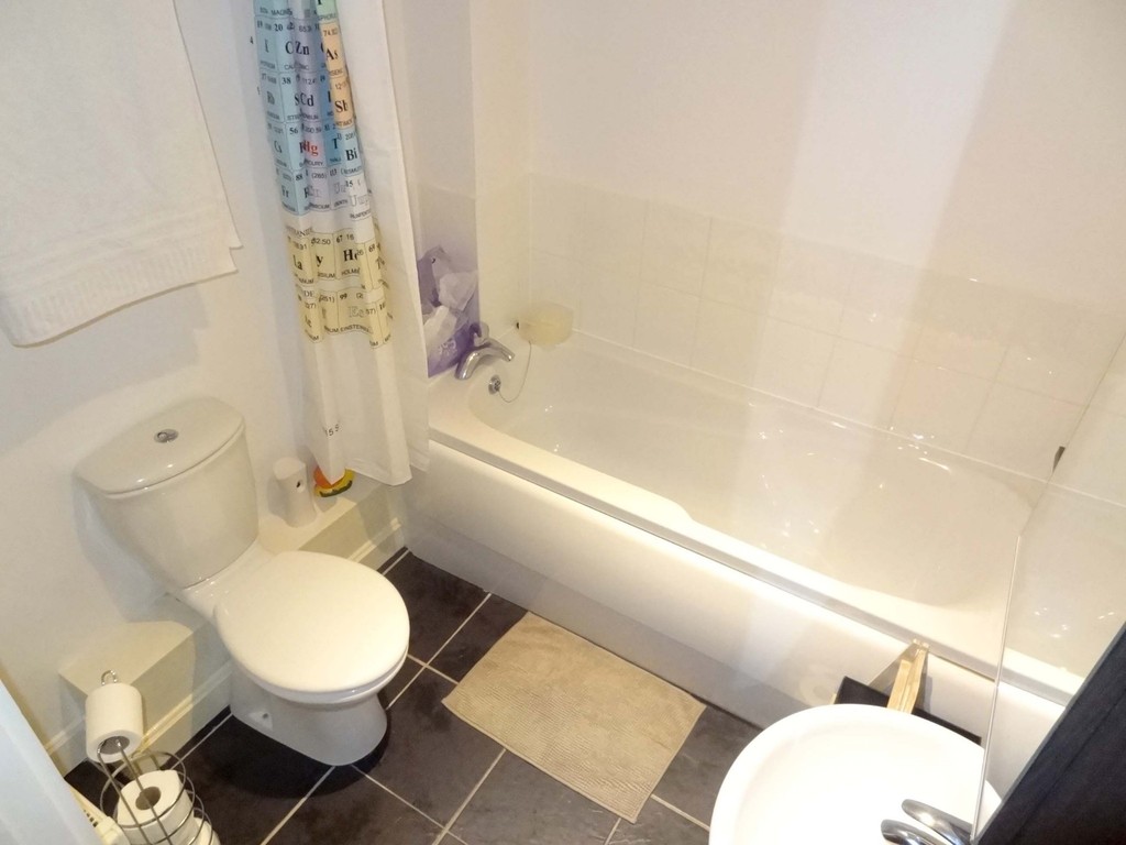Fitted with a modern white three piece suite, comprising bath with mixer tap and shower attachment with ceramic surround, matching closed coupled w/c, wall mounted hand basin with monoblock mixer tap and ceramic surround, extractor fan, radiator, tiled splash backs and ceramic tiled flooring.