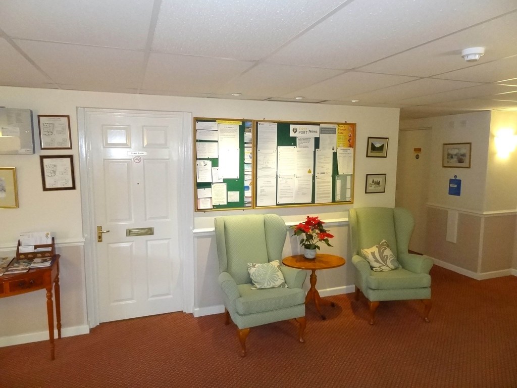 To the front the property is approached from the road by a car park which provides unallocated parking for residents and visitors. A secure entry front door leads along the communal hallways to the flat. There is a Development Managers office (Jenny) to the left whilst to the right is a large communal lounge which is well used by the residents along with the usual guest suite for use by visitors and the laundry room and bin store.