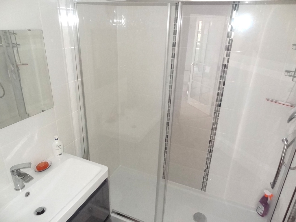 Beautifully moderised in the contemporay style this lovey bathroom features fully tiled walls and is fitted with a large sliding glazed door shower cubicle with adjacent vanity cupboard and wash hand basin with mirror over, closed coupled w/c, electric towel rail, extractor fan.
