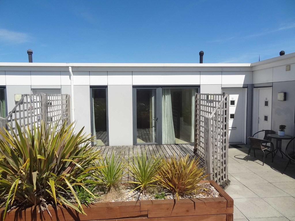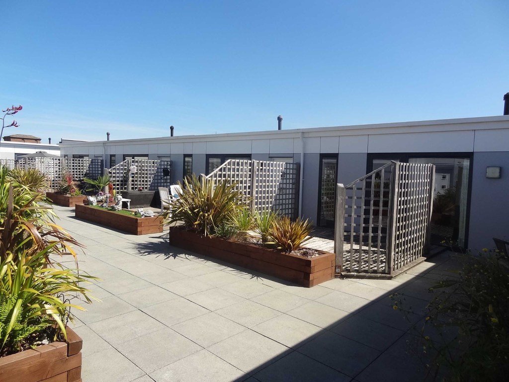 To the front arranged of the central Piazza the flats have railway sleeper style raised planters providing some separation from the central path. The main area between here and the flat then has been laid to decking with trellis screens to either side ready for pots, planters and garden furniture. Car parking is in a secure car park with electric gates (open with a (‘blipper’) where one space is allocated to this specific flat. A path from here leads to the front door of the building.