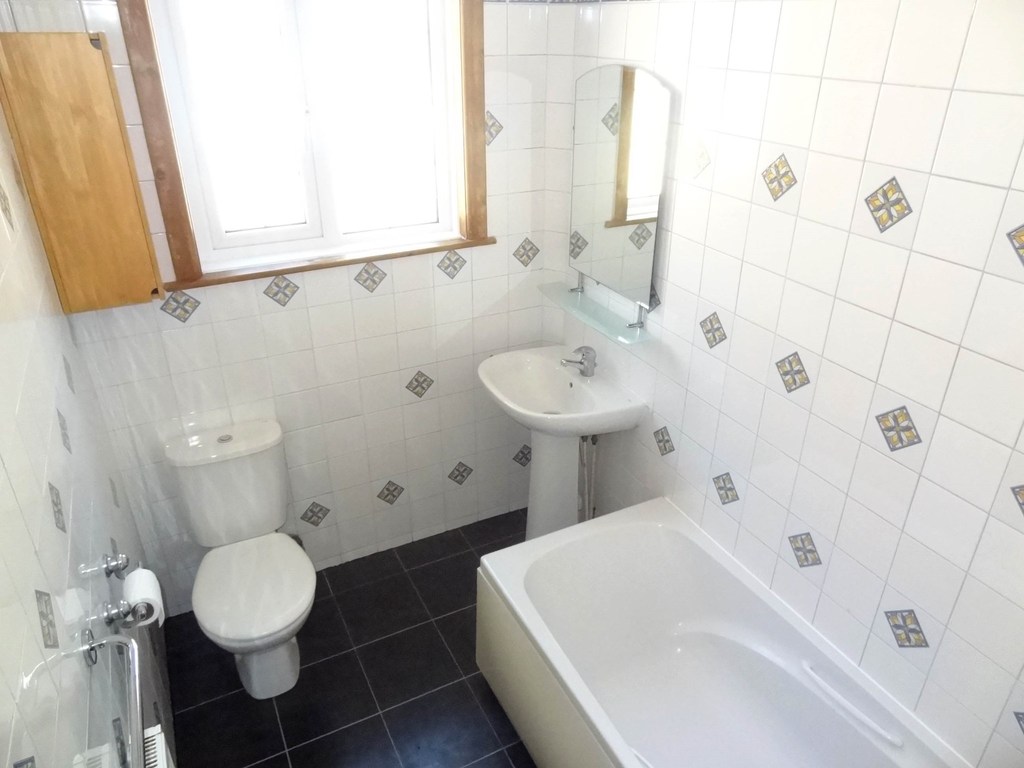 Window to rear aspect radiator, bath with shower, pedestal wash hand basin and closed coupled w/c, ceramic tiled walls and flooring.