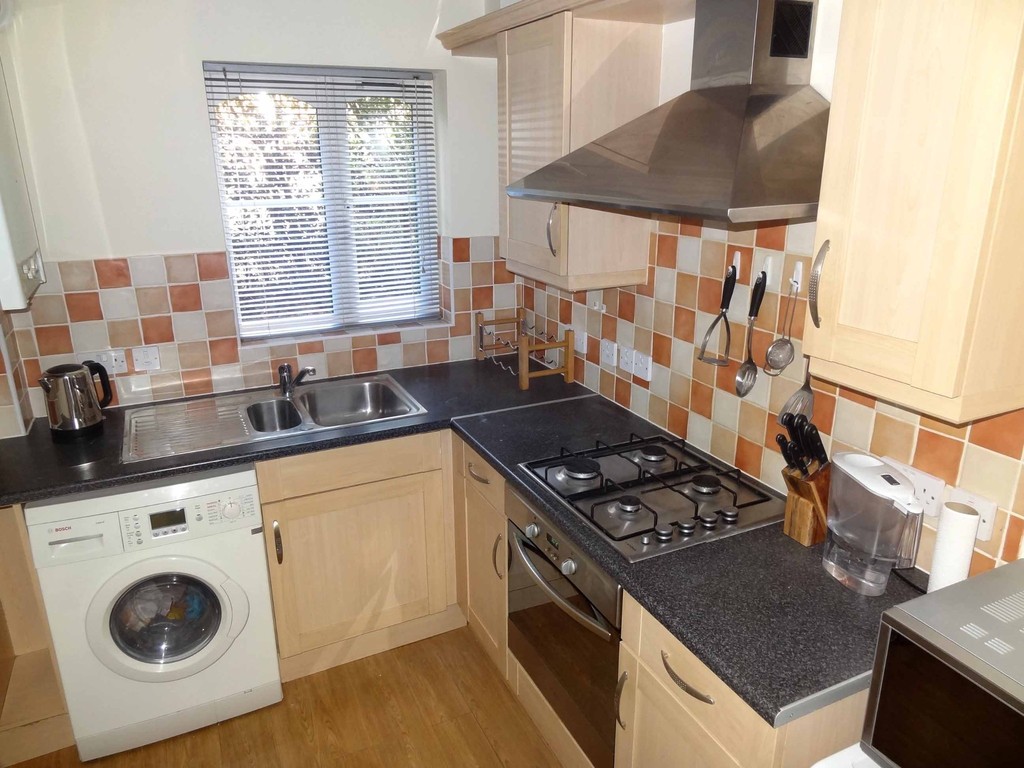 Window to side aspect, the kitchen has wood laminate flooring and comprises a one and a half bowl single drainer stainless steel sink inset into a range of rolled edge laminate working surfaces with drawer and storage units under. There are tiled splash backs leading to several wall mounted eye level units over. Cooking facilities are provided by a stainless steel four-ring gas hob with housed electric oven under and extractor hood over. There is under worktop space and plumbing for washing machine and space for a tall fridge freezer.