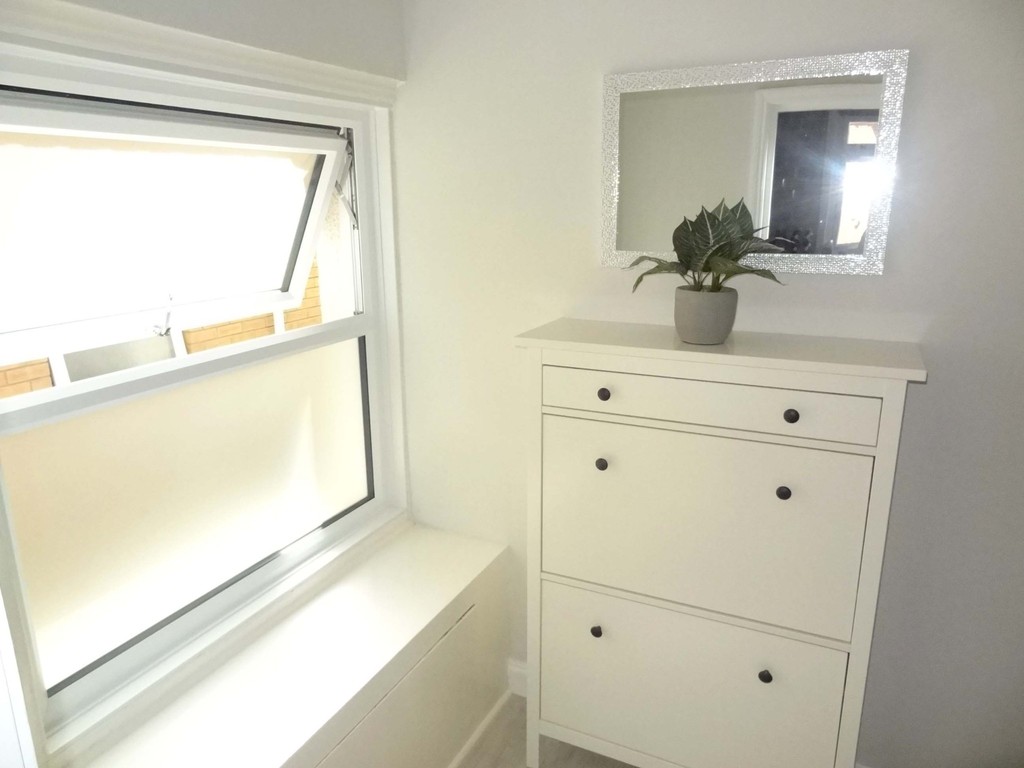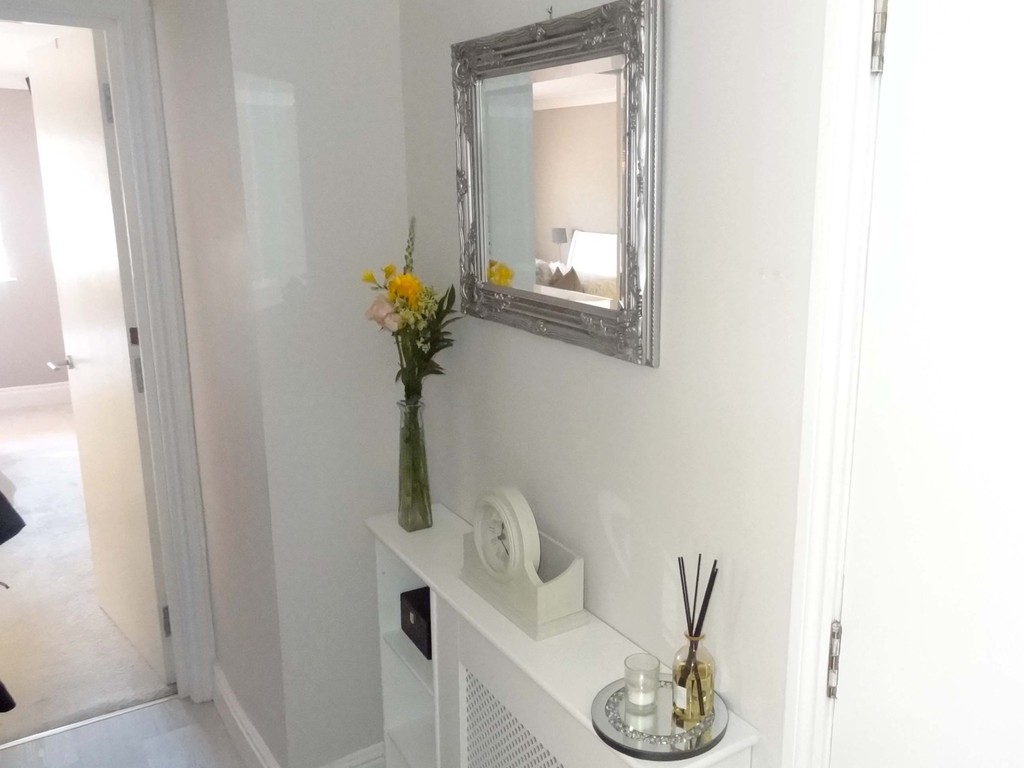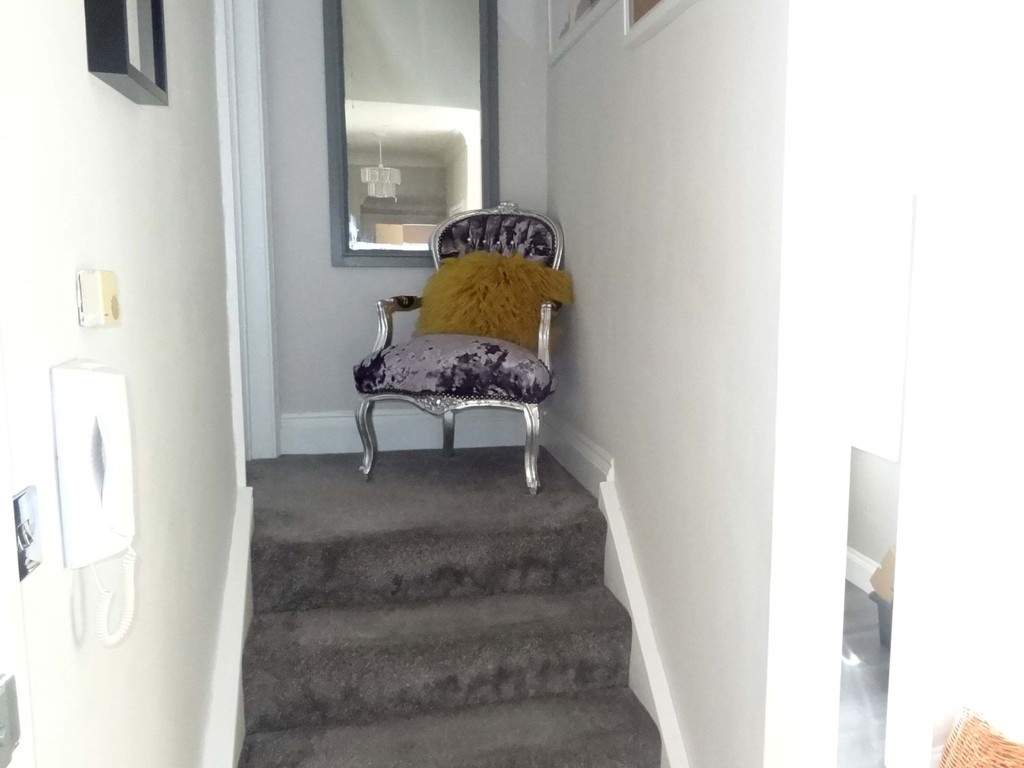 The hallway runs the length of the flat. In front of you as you enter is a wider area with window to the side aspect. There is a window seat with lift up storage and a door to kitchen. To the right the hall leads to the bedroom and bathroom, whilst to the left up a couple of steps is the living room.