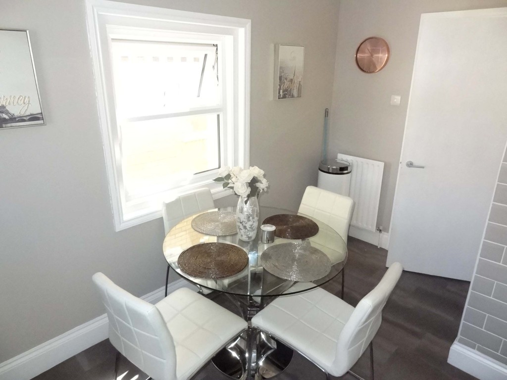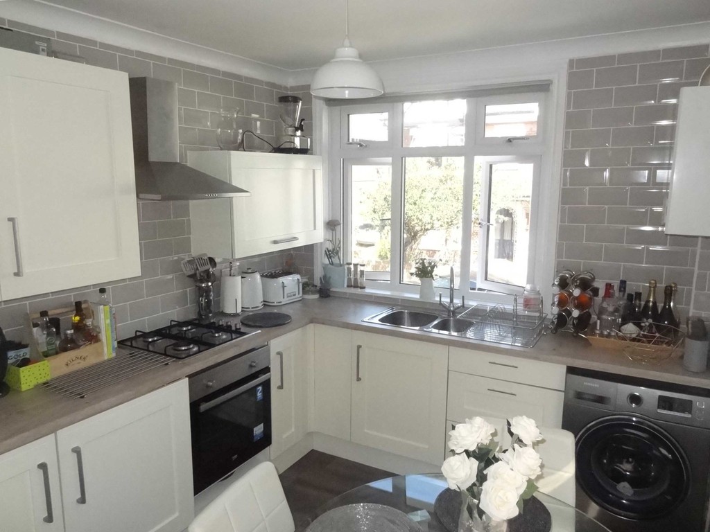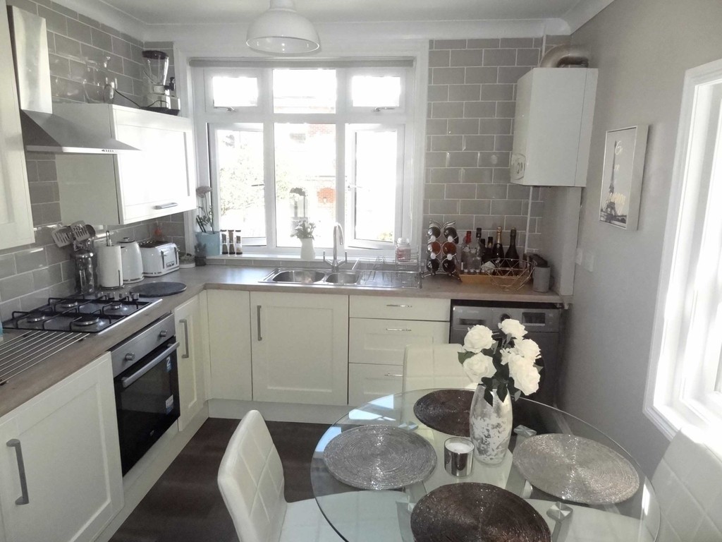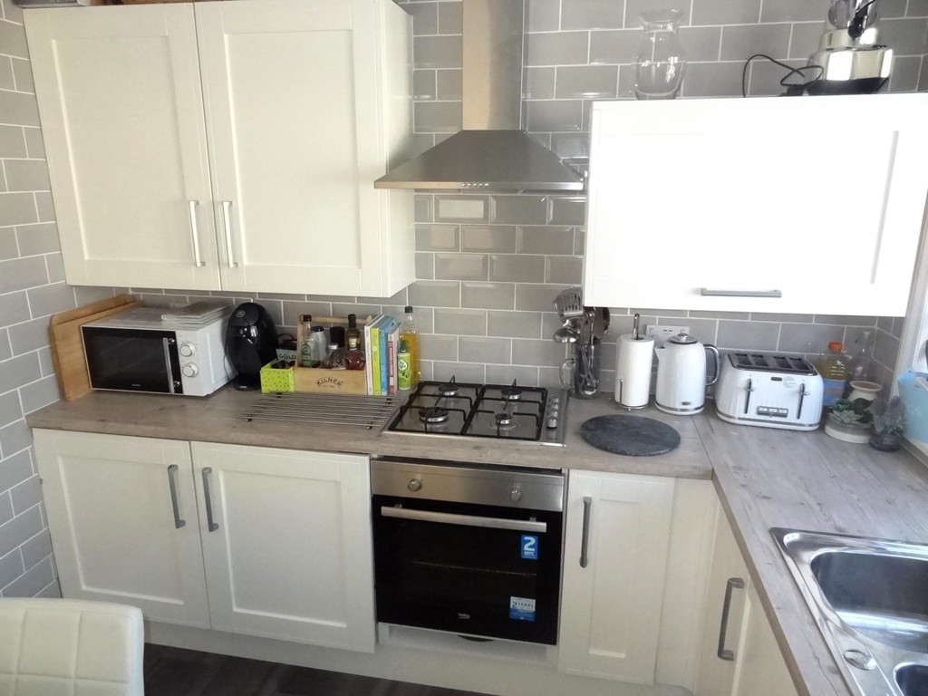 Window to front aspect, radiator, fitted with a one and half bowl single drainer stainless steel sink with a monoblock mixer tap inset into a range of wood effect laminate working surfaces with drawer and storage units under. There are attractive tiled walls above which also form splash-backs, leading to several wall mounted matching eye level units. Cooking facilities provided by an inset four ring gas hob with extractor hood over and housed electric oven under. There is under worktop space and plumbing for washing machine, space for tall fridge/freezer. Further window to side aspect by the breakfast/dining table and to one wall is the gas fired boiler which serves the hot water and central heating system.