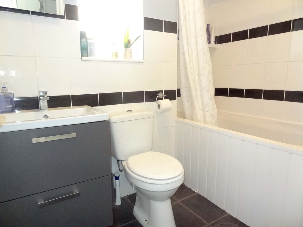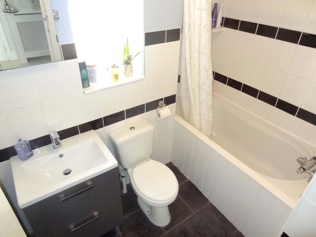 Window to side aspect, radiator, the bathroom is fitted with a modern white suite comprising alcove mounted bath (fully tiled walls and shower unit) adjacent closed coupled w/c with vanity basin to the side, with monoblock mixer tap and small storage cupboard under.
