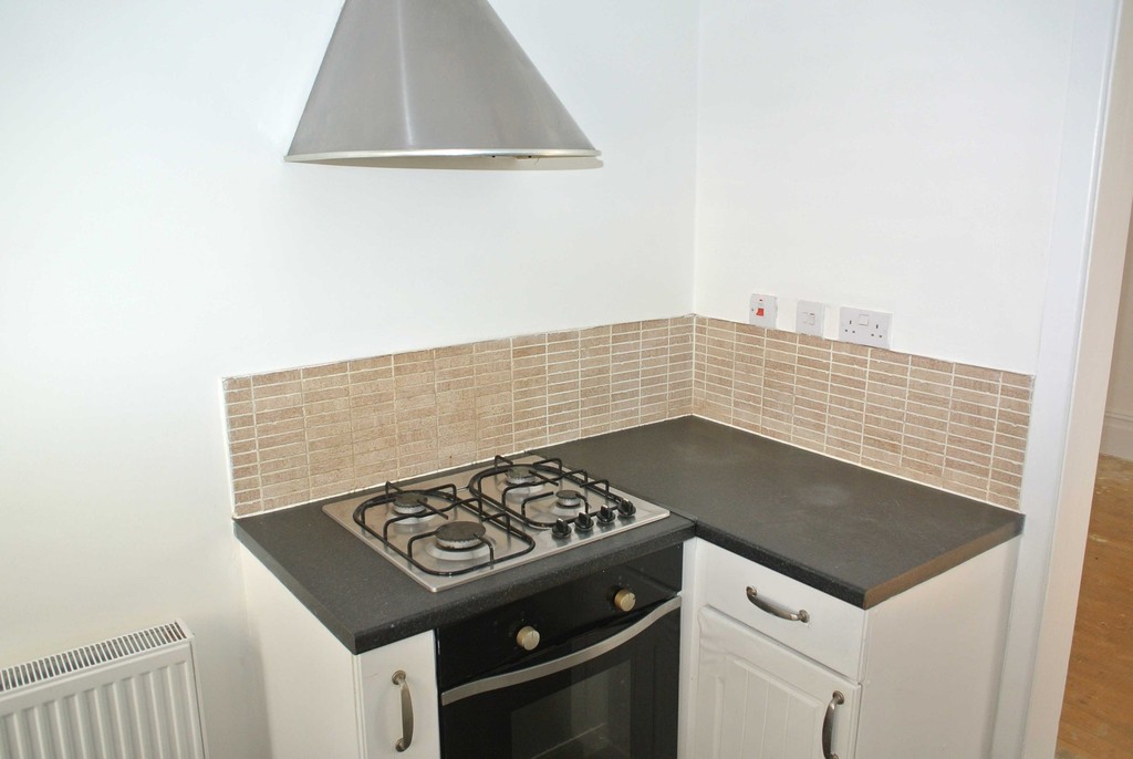 Window to side aspect by the door. The kitchen features a range of white fronted wall and floor units with rolled edged laminate worktops and tiled splashbacks. There is an inset sink and drainer whilst cooking facilitioes are provided by a gas hob with housed electric oven under and extractor hood over. Spaces for fridge/freezer and washing machine. Door to living room and the rest of the flat.