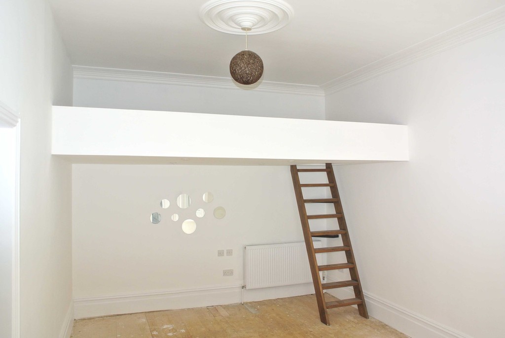 Bay window and door to sunny rear aspect and to the rear of the room is a staircase that leads up to the mezzanie balcony which although has restricted ceilinh height, still provides an ammenity space that has even been used as a bed area in the past by the current owner. In the main area is ample space for both sofa and dining suites.