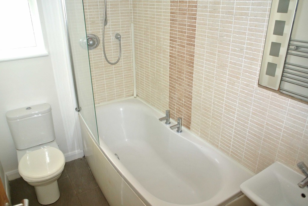Obscure glazed window to side aspect the bathroom is fitted with a modern white suite comprising bath with shower over and glass splash screen. Part tiled walls, close coupled WC and wash basin.