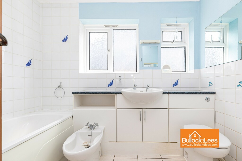Obscure glazed windows to rear aspect, the bathroom is fitted with a four-piece, modern, white suite, comprising bath with mixer tap and shower attachment with fully tiled wall surrounding. Adjacent to here is a long vanity unit with storage cupboards, half inset oval basin and matching bidet and WC, double panel radiator.