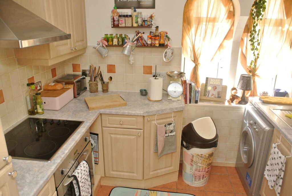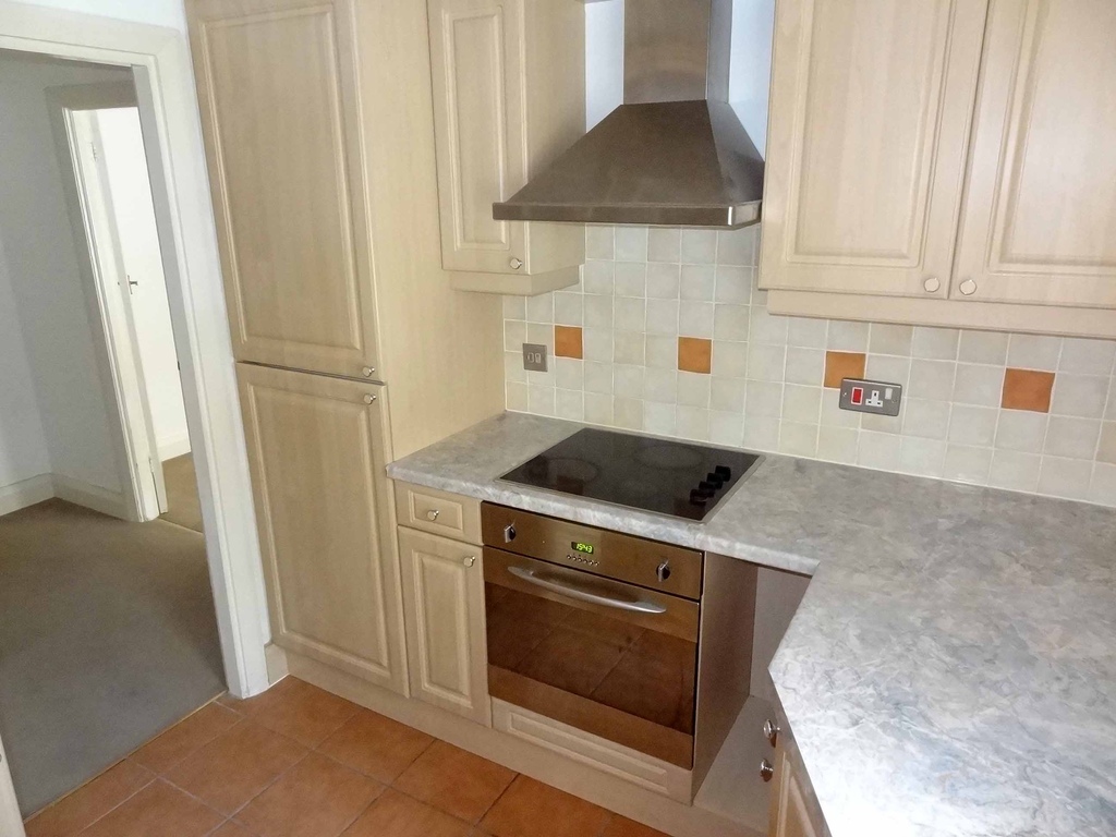 Twin arch topped windows overlooking courtyard, the kitchen is fitted with a range of maple effect units and comprises a single bowl, single drainer stainless steel sink with mono-block mixer taps inset into a range of roll edged laminate working surfaces with drawer and storage units under, tiled splash backs to the working surfaces leading to a range of matching range of wall mounted eye-level units over, three of which are glass fronted display units, under worktop fitted automatic washing machine, integrated tall fridge and freezer, whilst cooking facilities are provided by a four ring electric hob with housed electric oven under and re-circulating stainless steel fume hood over, central light point, smooth set coved ceiling.