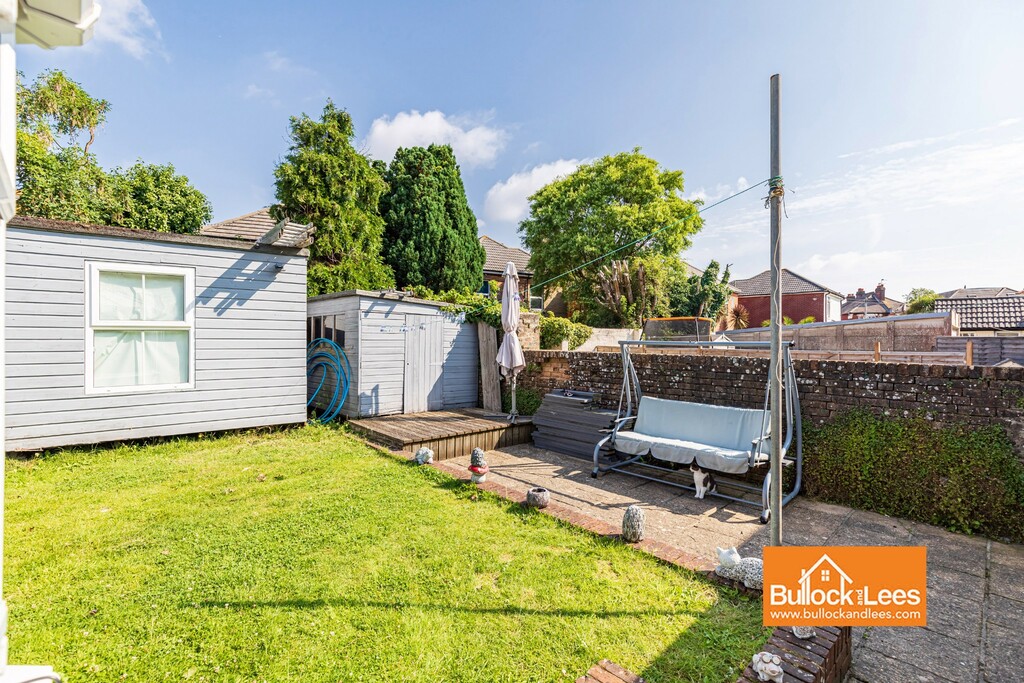 The rear garden features a patio area to the right that leads to a rear tool shed and large workshop/office, home gym or similar. It has a central, double door and windows to either side. The rest of the garden is laid to lawn with the boundaries being provided by the shed and workshop at the rear with bricks walls to the sides.