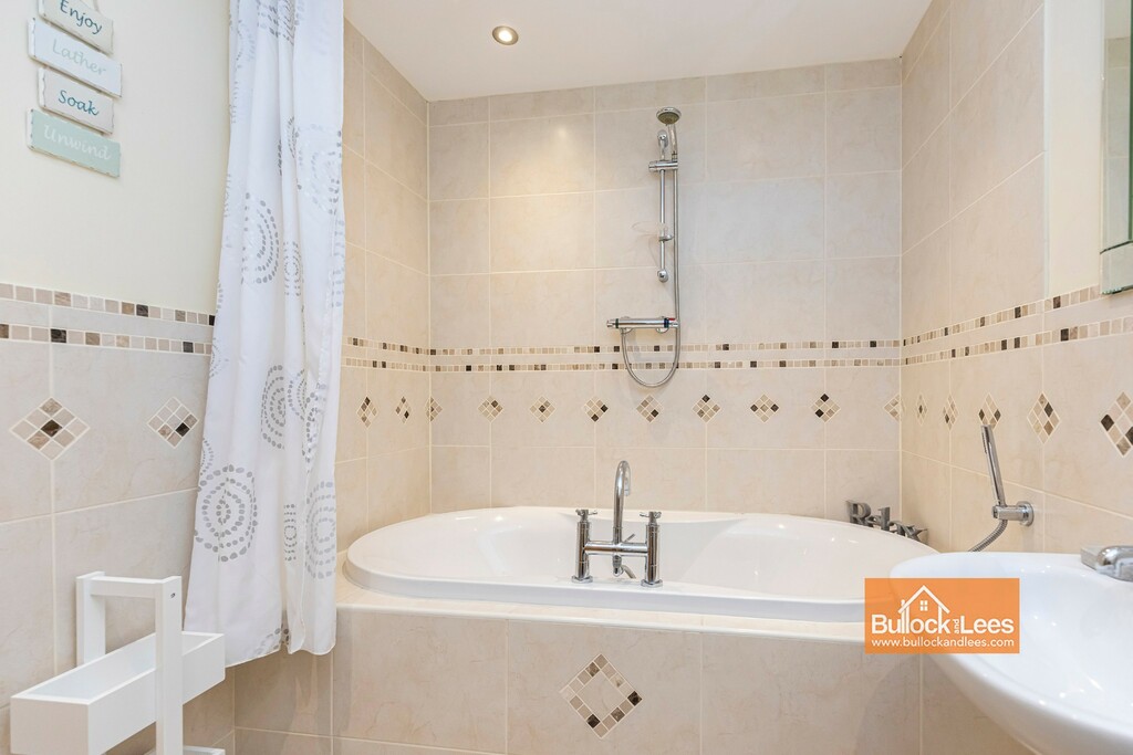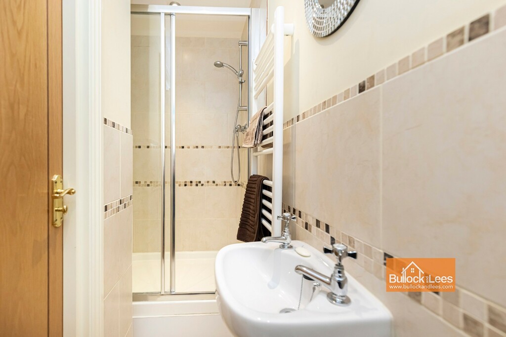 Window to front aspect and with a large range of built-in wardrobe as you enter with a main bed area at the end by the window giving space for double bed, dressing table etc. To the left of here is the En-suite Shower Room which has a large shower cubicle to one end and then a basin and matching WC to the side. Half tiled walls and a ladder style heated towel rail/ radiator.